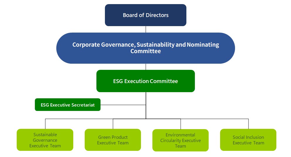 On December 28, 2021, the company’s Board of Directors approved the organizational procedures for the Sustainable Development Committee Charter and established a functional committee under the Board of Directors, the “Sustainability Committee” as the highest-ranking governance unit, consisting of the Chairman and two independent directors. The Chairman also serves as the chair of the “ESG Execution Committee” and is responsible for overseeing the four executive task forces formed by the company’s senior management teams, which hold quarterly meetings to discuss and formulate the company’s ESG management approaches and specific metric or target used to measure respective progress. On the other hand, the responsibility of ESG Executive Secretariat is to coordinate the committee works to identify the ESG topics to be managed by each team, conduct related performance appraisals and reporting disclosures, and submit the report to the Board of Directors at least once a year (the 2024 report was submitted on May 30, 2024 and December 26, 2024).