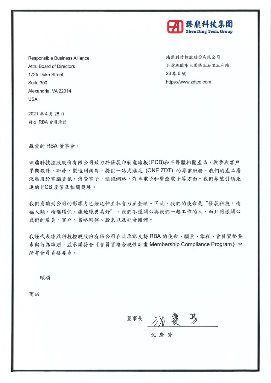 臻鼎科技集團為RBA 責任商業聯盟正式會員之一,一直積極地承擔企業社會責任,確保勞工、健康與安全、環境、道德規範及管理體系符合要求。我們堅信,經營企業是要與供應商協同發展,我們制定了供應商社會責任行為準則並要求供應商遵守。
